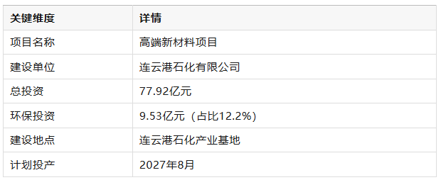 连云港石化77.9亿元高端新材料项目获批前公示,2027年投产在望